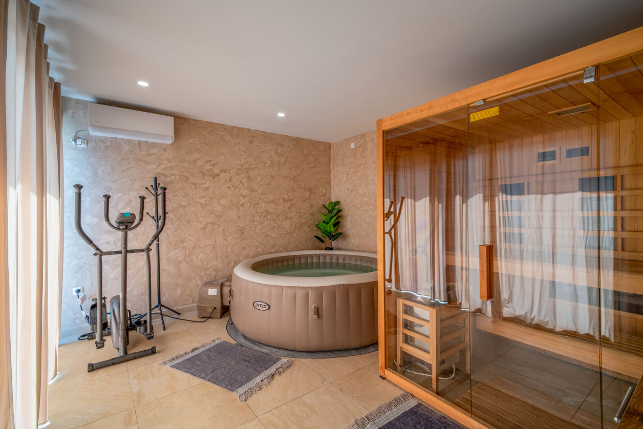 Središnji dio je zamišljen kao zajednički prostor za kuhanje i druženje. Sastoji se od pečenjare, spa zone, bazena i velike natkrivene terase. Pečenjara je zatvorena, no otvaranjem kliznih prozora pretvara se u poluotvorenu. Sastoji se od zidanog roštilja, ražnja, krušne peći i kuhinje. Kuhinja je opremljena indukcijskom pločom, perilicom suđa, hladnjakom i pripadajućim suđem. Niže pečenjare nalazi se velika natkrivena terasa idealna za blagovanje većeg broja ljudi. Do terase se nalazi veliki bazen sa grijanom vodom, te ležaljke. Iznad bazena je smješten jedan objekt – spa zona. U njoj se nalazi finska/infracrvena sauna, jakuzzi, orbitrek, ležaljka, kupaonica, te ostava s perilicom rublja i ostalim pomagalima